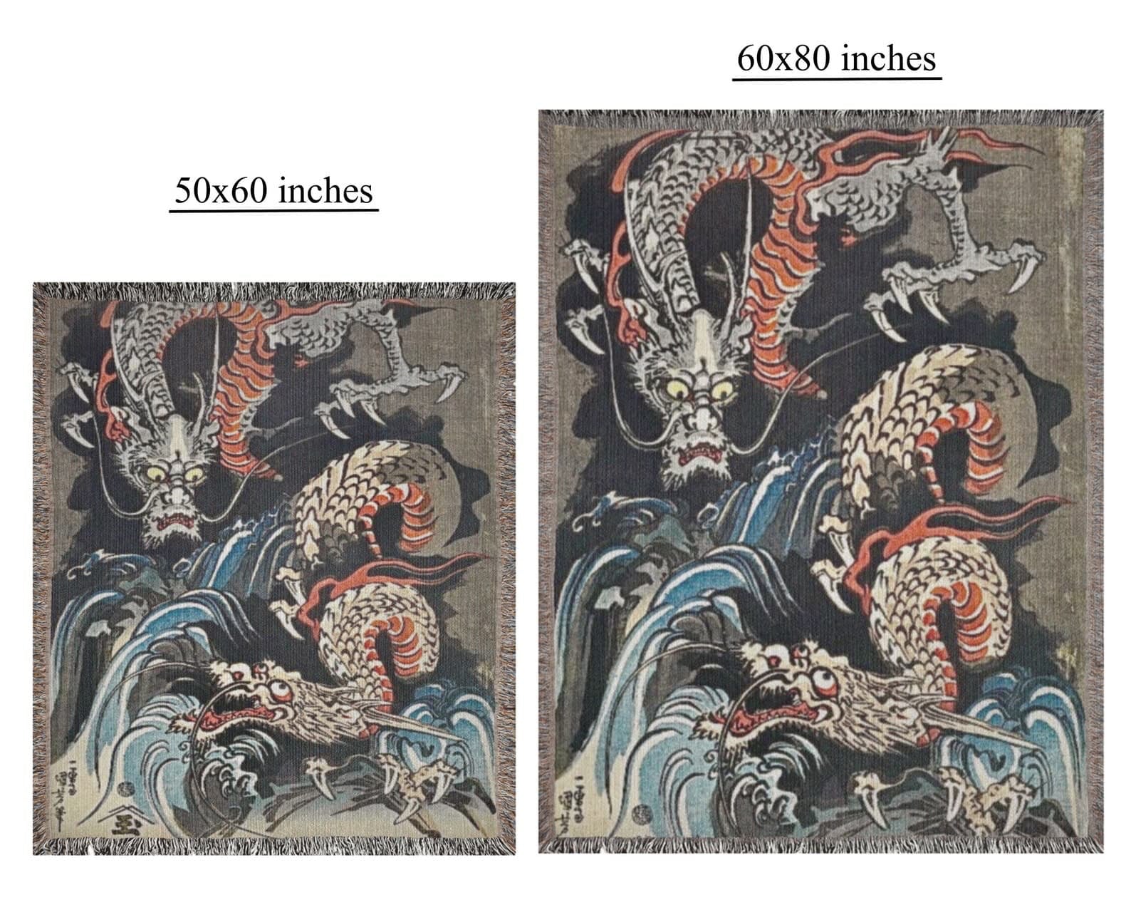 Dragon vintage art painting on cotton woven throw blanket by Japanese artist. Two dragons by a waterfall, ukiyo-e style woodblock print (1831) by Utagawa Kuniyoshi.
